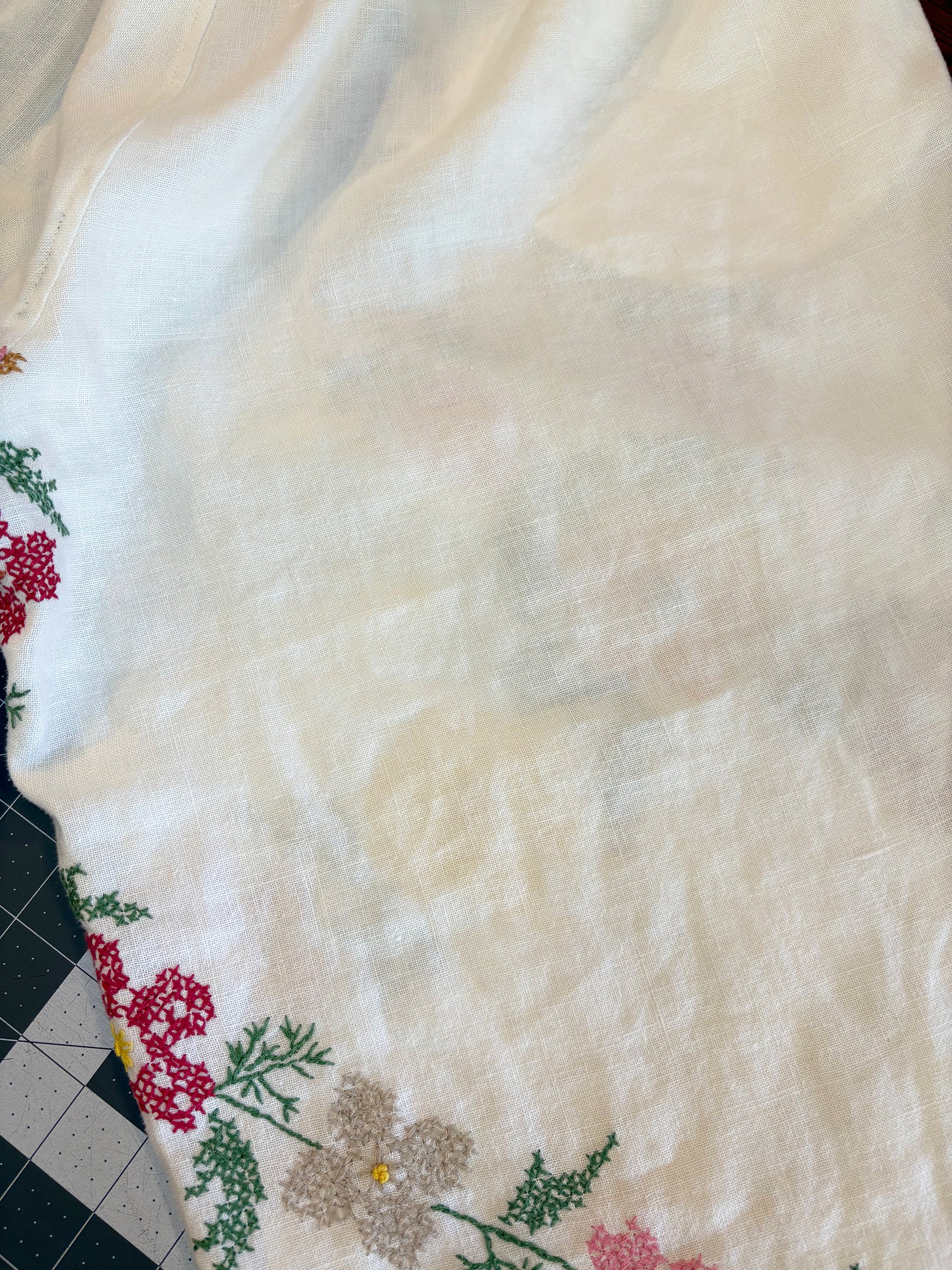 These pants are made from a vintage tablecloth. Minor imperfections are to be expected & are part of the charm. Anything major will be noted.