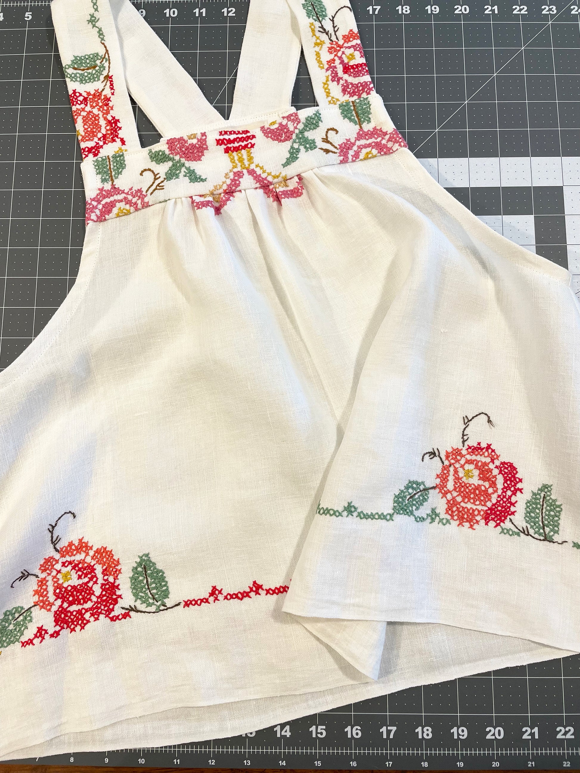 I was able to squeak both a top & a dress out of this tablecloth! Since I used the "leftover" pieces for the top, I wasn't able to line up the pattern as nicely as I like to. This isn't really a flaw - more of a quirk of an upcycled piece. Same with the hem. I used the selvage edge of the cloth, rather than adding a hem, to preserve as much length as possible. There are a couple of X-stitches on the back of one strap, where only one leg of the X was completed (see photo) & I noticed one loose stitch. All of these things are very minor & not really noticeable.