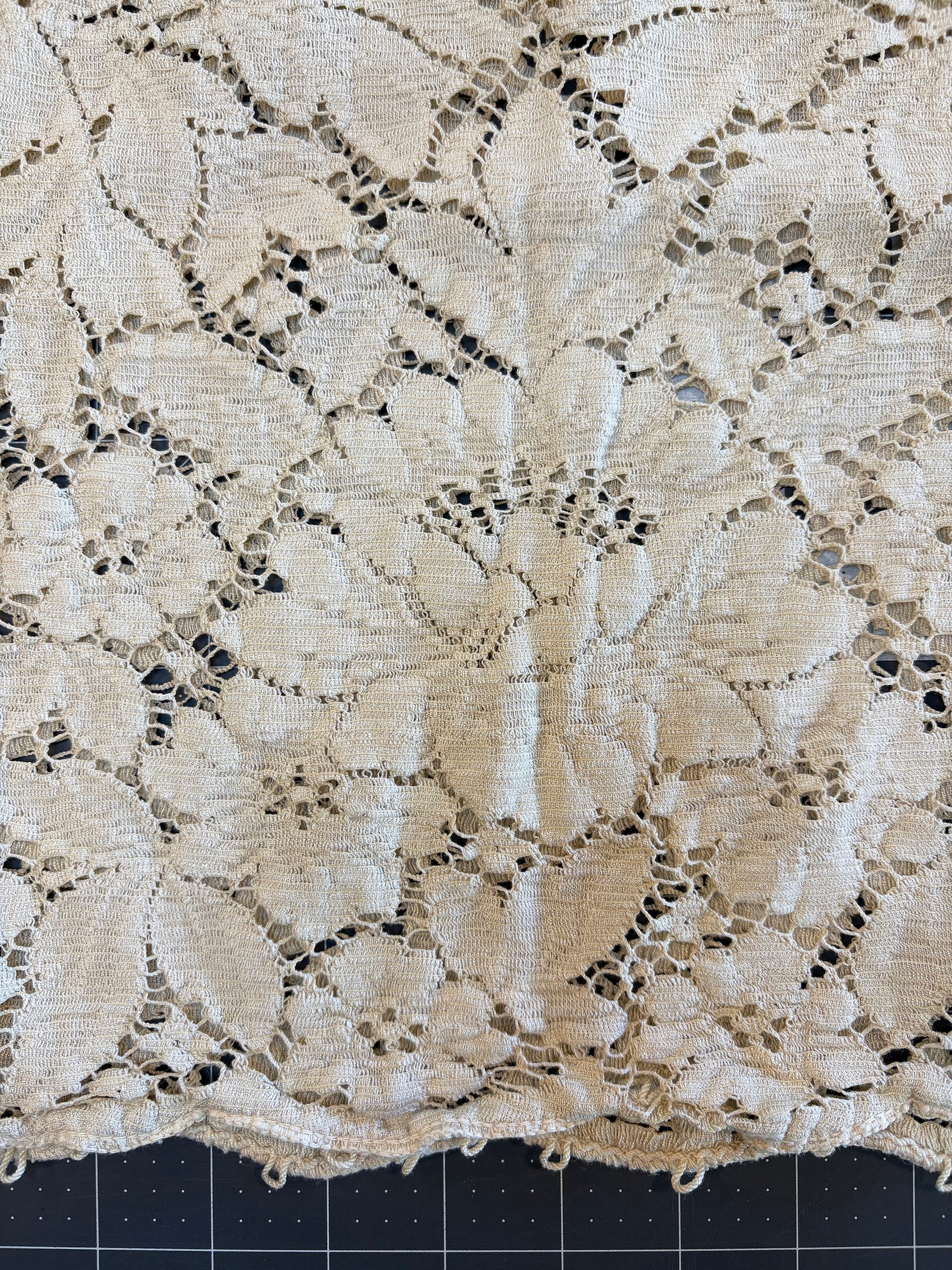 This top is made from a vintage Quaker Lace Co. tablecloth. The fabric is medium weight (heavy for lace) with a subtle sheen & a beautiful drape. I believe the content to be a cotton/rayon blend, however, it could have a small percentage of polyester in it also. The company started adding poly to their lace in the 1960's or 70's, but in such a small amount that it can be hard to tell just by feel. Either way, it's an absolutely gorgeous fabric - molding to the contours of the body, without being clingy. Dark cream/light ecru color. Scalloped edging with picot trim.